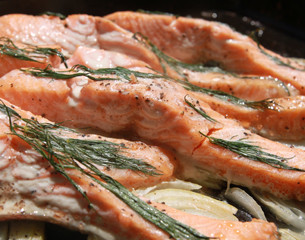 Порежьте лук тонкими кольцами и выложите на противень, смазанный растительным маслом. Порежьте форель тонкими ломтиками и разложите по луковой подушке. На каждый кусочек форели положите несколько веточек укропа, предварительно встряхнув укроп так, чтобы на нем не осталось воды. Помелите сверху черный перец и посыпьте морской солью. Аккуратно, из ложечки, полейте куски рыбы сливками. Нагрейте духовку до 180 градусов и поставьте в нее рыбу на 20 минут.