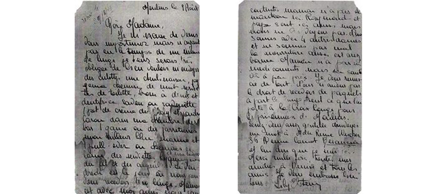 Вот что пишет Лили из тюрьмы своей знакомой: «Моя дорогая, я заранее приношу свои извинения за причиненное беспокойство. Буду очень признательна, если Вы сможете мне передать комплект белья, комбинацию, пижаму, туалетные салфетки, зубную щетку, мыло, баночку крема, пудру, которые вы найдете в моей комнате. А также прошу передать мой голубой шерстяной свитер, нитки и иголки. Мама тут со мной, папа и Раймон тоже, но мы с ними не видимся. У мамы нет с собой лекарств, но она держится. Передача белья разрешена только по пятницам, разрешено только то, что передается через Красный Крест. Я Вам очень благодарна! И не могли бы Вы передать Рене Вукеру, что мы тут. Обнимаю Вас, Лили Эбштейн».