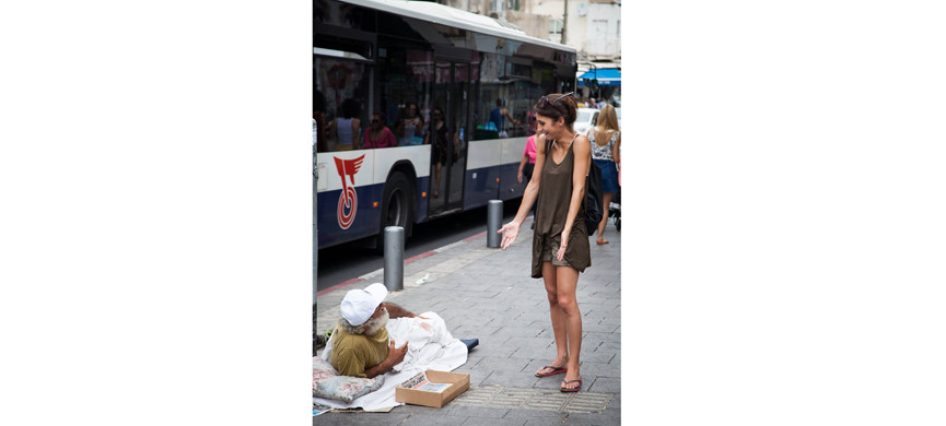 51-летний Саул попал на улицу полгода назад, но, несмотря на откровенное безразличие к своему будущему, до сих пор старается вести нормальный образ жизни, даже пользуется мобильным телефоном. «Я никогда бы не подумал, что это так легко – оказаться на улице. Дело одной минуты, – рассказывает Саул. – Харедим привыкли жить в бедности, и вот куда меня привела эта привычка». Когда его жена умерла, Саул остался с шестью детьми, которые в итоге попали в приемные семьи. Когда мужчина не смог выплачивать ипотеку, его выгнали из квартиры. Сначала он работал в местном продуктовом магазине и жил здесь же, в подсобке, но зимой его уволили, и над головой не осталось даже чужой крыши. Саул говорит, что сообщество харедим негативно восприняло его критику их образа жизни, «культивирующего бедность и безответственность», и он переехал на улицу Дизенгоф, где и живет последние полгода. За это время Саул успел пожить в строящихся зданиях, под открытым небом в парке и в местной синагоге, но ему себя совсем не жаль. Он перебивается случайными заработками и рассказывает сердобольным прохожим свою историю, за что ему иногда дают несколько шекелей.