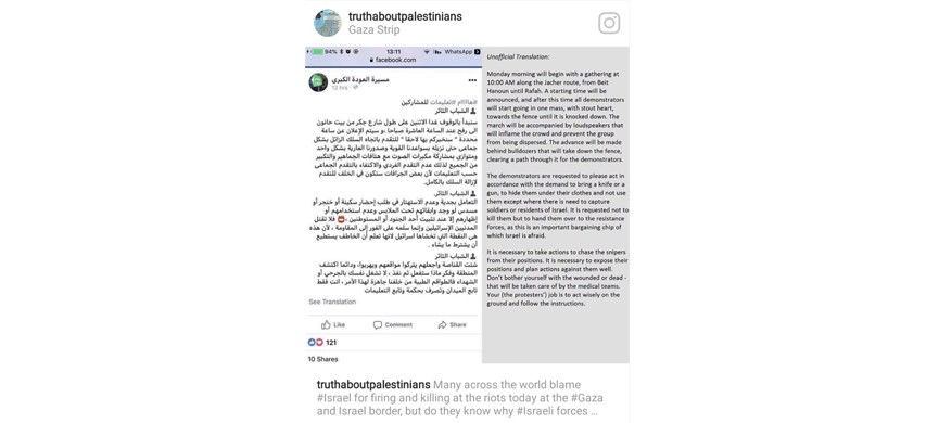 Эти подделки для европейских СМИ и политиков перевешивают реальные факты. Ведь палестинцы были неоднократно предупреждены о запрете подходить к пограничной ограде и тем более о недопустимости попыток пробить в ней бреши. А среди невооруженных погромщиков были и вооруженные террористы, которые скрывались в толпе, пользуясь большим скоплением людей. Видимо, выполняя призыв этой листовки, распространённой движением ХАМАС, которая требует «скрывать поначалу оружие и пользоваться им только для того, чтобы пленить или убить израильских солдат».