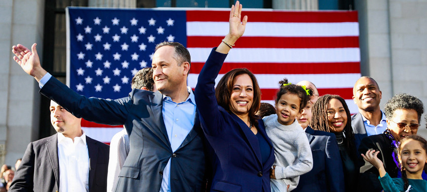 На праймериз кандидатов в президенты от Демократической партии Камала продержалась недолго, а выход её из гонки был отмечен публикацией фото, на котором она сидит на коленях у мужа, а тот – «поддерживает её, как и всегда». Впрочем, за время той гонки и она, и Дуглас успели наработать нехилый политический капитал. Публика полюбила её супруга за открытость и вовлеченность: он не пропустил ни одного публичного выступления Камалы, болея за свою «половинку».