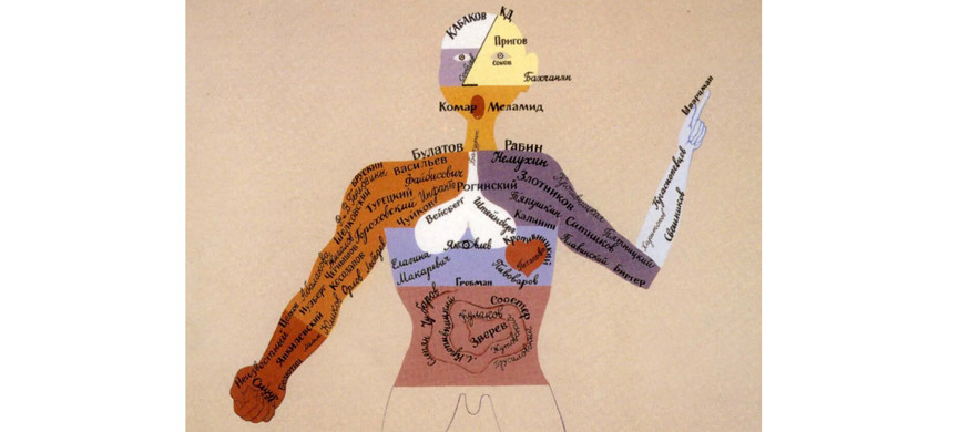 В 1998 году один из крупнейших российских художников-концептуалистов Виктор Пивоваров нарисовал «Тело московского неофициального искусства 1960–1970-х годов». По контурной фигурке человека разбросаны имена – чьё-то на руке, чьё-то в желудке или в легких. Своего близкого друга Илью Кабакова он поместил в мозг – причём в правое его полушарие! Согласно популярному околонаучному мифу, именно оно отвечает за творчество в целом и изобразительное искусство в частности.