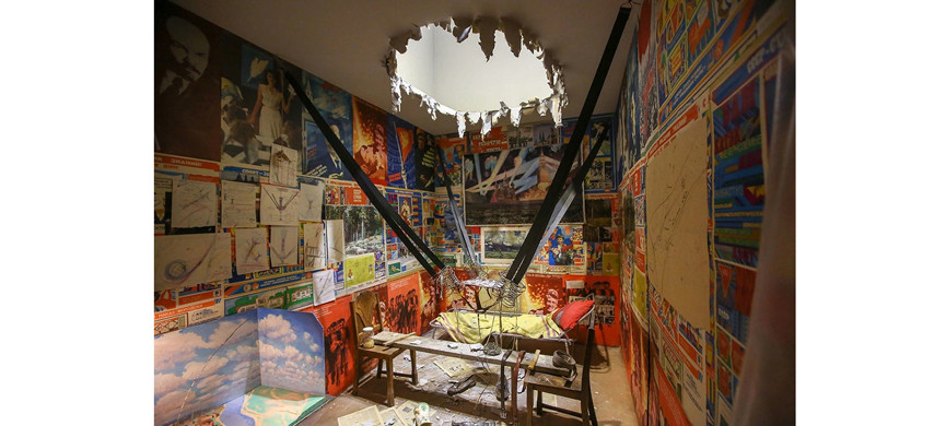 Ярче всего эта метафора показана, пожалуй, в легендарной кабаковской инсталляции «Человек, улетевший в космос из своей комнаты». Скромная каморка с раскладушкой, а посередине – самодельная катапульта. И огромная дыра в потолке. Человек улетел из душного мирка, но куда и успешно ли – остаётся решать зрителю.