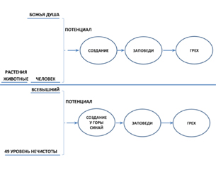 – В книге «Тора Ор» Алтер Ребе поясняет процесс сотворения. По приказу Творца земля произвела и растения, и животных, и душу, и материю – всё вместе сразу. Человек же создан по-другому: был взят прах, то есть низшая форма материи, и к нему была добавлена высшая часть души – божественная душа (см. рисунок). Таким образом была создана огромная разница потенциала для выполнения основной задачи, данной Творцом первому человеку – «охранять и обрабатывать сад», по сути – привлекать свет для уничтожения зла. Первый человек был создан, получил заповеди и согрешил.