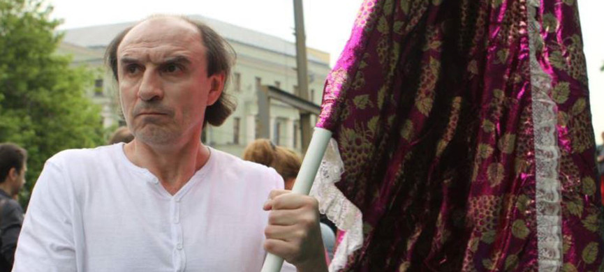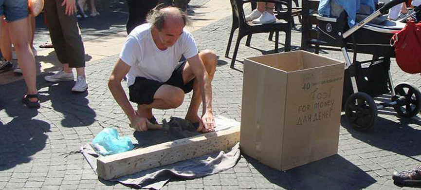 И тогда мой персонаж понял, что нужно не просто стоять, а что-то делать, потому что платят за работу, за труд. Так что на четвертый раз он решил заняться простым трудом: он начал забивать гвозди в доску и делал это в течение часа. И тут люди стали интересоваться, а чем я тут таким занимаюсь. Если выйти за рамки персонажного высказывания, то в данном случае мне хотелось найти какое-то очень знакомое, законченное, короткое и понятное действие, вырвать его из привычного контекста и перенести на площадь, чтобы вызвать полное недоумение.