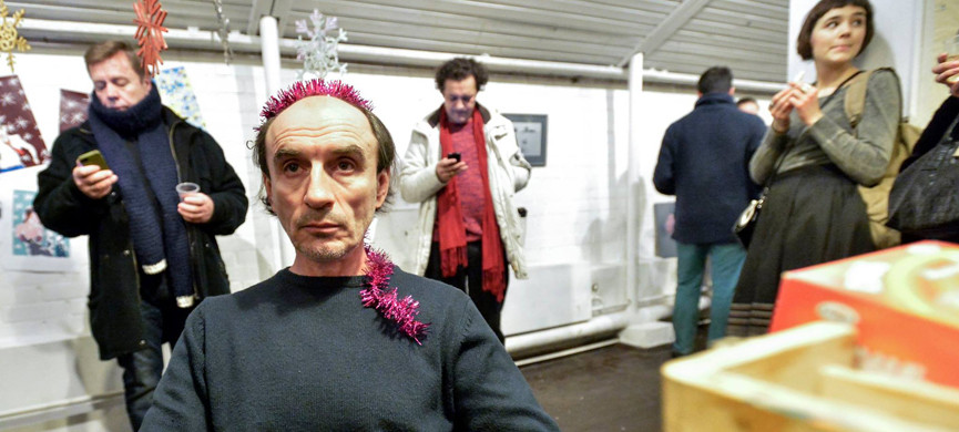 – Пять. По логике моего персонажа, после того как он постоял с сеткой с «эвакуационным набором», он должен был продемонстрировать сервильность. Для этого он в моем лице принарядился, нацепил бабочку в виде цветочка, надел детскую корону и начал улыбаться. Естественно, к такому дураку опять никто не подошел. Кстати, интересно наблюдать за реакцией публики – никаких наездов, никакой агрессии, но контакта тоже нет, есть доброжелательное безразличие. Итак, никто не подошел, так что наступило время третьего перформанса – мой персонаж решил торгануть своим «широко известным» именем, ведь он – сам концептуалист Кругликов! Это тоже не сработало – никто его, оказывается, не знает, это ведь не Джозеф Кошут. Впрочем, и Кошута здесь не очень знают.