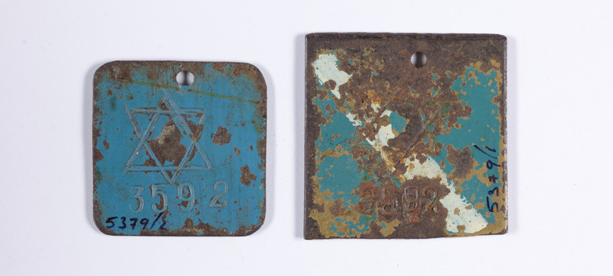 Металлические бирки арестанта из лагеря Хасаг Пелцери. Коллекция артефактов, Яд ва-Шем.