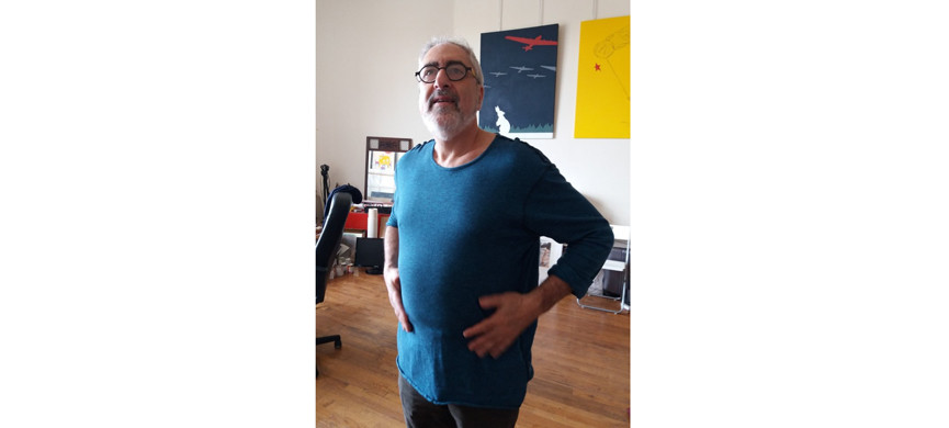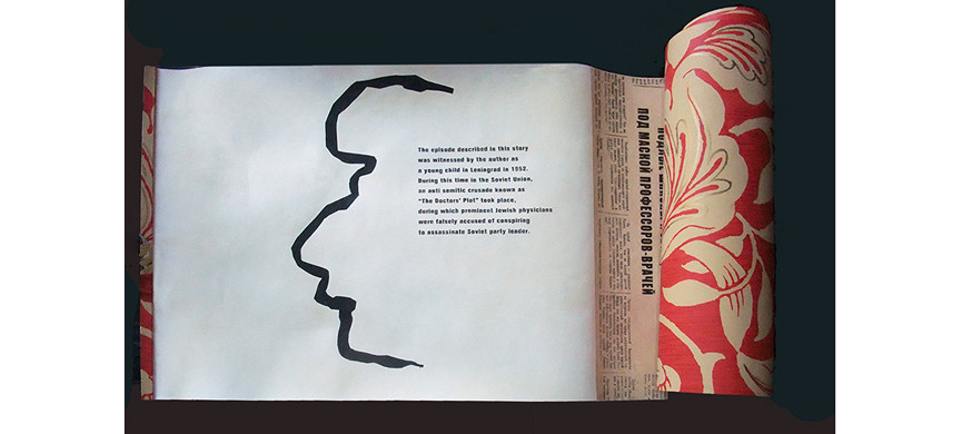 – В этой книге я впервые выступил не только как художник, но и как писатель – рассказал эпизод из детства. Однажды папа, а он был, как инженер, вечно занят, говорит: «Пойдем гулять, зайдем к моим знакомым». А я шнурки плохо завязывал. И вот я, путаясь в шнурках, иду по Ленинграду. Я описываю это в книге, и там иллюстрации сделаны будто шнурками, и сама она выполнена в виде свитка – длинной улицы. Свиток – это древняя, исконная форма книги. У меня он из обоев, и вот почему: мы зашли в незнакомый мне дом, дверь открыла заплаканная женщина. Меня, мальчика из приличной еврейской семьи, сразу потряс беспорядок: мебель перевернута, растрепанные книги, разбросанные по полу вещи. Папа и женщина долго говорили – на языке, который я не понимал. Прощаясь, он сказал: «Я постараюсь вам помочь. Запишите мой телефон». А она: «Мне и записать некуда, все телефонные книги забрали». И подходит к стене, отрывает кусочек обоев, но не до конца, пишет на обратной стороне номер, плюёт на этот надорванный кусочек и приклеивает его обратно. Это был шок – мне не разрешали на обоях даже рисовать!
