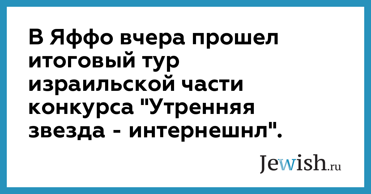 Пословица "Когда говорят пушки — музы молчат" была полностью опровергнута вчера в Яффо, где в помещении театра "Гешер" при полном зале прошел итоговый тур израильской части конкурса "Утренняя звезда — интернешнл", сообщают наши коллеги с израильской радиостанции Аруц Шева. В отборочных турах конкурса, коспонсорами которого являлись российская компания "Юникс", радио "Седьмой канал" и компания "Круиз интернешнл", приняли участие свыше ста израильских молодых талантов. В ходе заключительного тура с приветствием к участникам и организатором праздника обратились депутат Кнессета от партии "Ликуд" Сильван Шалом и председатель комиссии Кнессета по репатриации и абсорбции депутат Неоми Блюменталь. По окончании выступлений председатель жюри конкурса, известный советский, российский (а теперь уже и израильский) композитор Владимир Шаинский объявил имена трех его победителей. Ими стали: Татьяна Ронина из Беэр-Шевы; Карина Ржищева из Бат-Яма и уроженец страны Зиф Хен из Тель-Авива. Зал театра "Гешер" не смог вместить всех желающих. Победители конкурса поедут в Москву, где примут участие в фестивале "Утренняя звезда — Интернешнл", который также проводится под эгидой компании "Юникс", возглавляемой популярным телеведущим Юрием Николаевым.