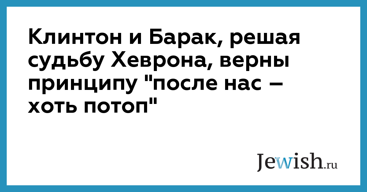 Палестинская газета "Аль Ха-Йам" опубликовала 27 декабря засекреченную доселе в Израиле информацию о предложениях, выдвинутых президентом США в качестве основы будущего мирного израильско-палестинского соглашения, сообщает агентство "Курсор". Согласно предложению Клинтона, безоговорочно поддержанному премьер-министром Израиля Бараком, еврейский квартал в Хевроне (Авраам Авийну) и Кирьят-Арба останутся под израильским контролем на протяжении ближайших двадцати лет, после чего будут переданы под палестинский суверенитет. Иудейская святыня – могила Праотцев (Маарат Ха-Махпела) в Хевроне вообще не упоминается в документах, цитируемых палестинской газетой. В ходе форума парламентских и внепарламентских правых движений, прошедшего 26 декабря, лидер поселенческого движения Хеврона Ноам Арнон заявил, что жители еврейских поселений не оставят живыми свои дома и положат жизни для того, чтобы остаться на землях, завещанных праотцами и Торой. Остается лишь пожелать Клинтону и Бараку долгих лет жизни, чтобы через 20 лет они в полной мере могли насладиться плодами своих "мирных инициатив". Впрочем, текущие события в Хевроне позволяют строить довольно мрачные прогнозы уже на самую ближайшую перспективу.