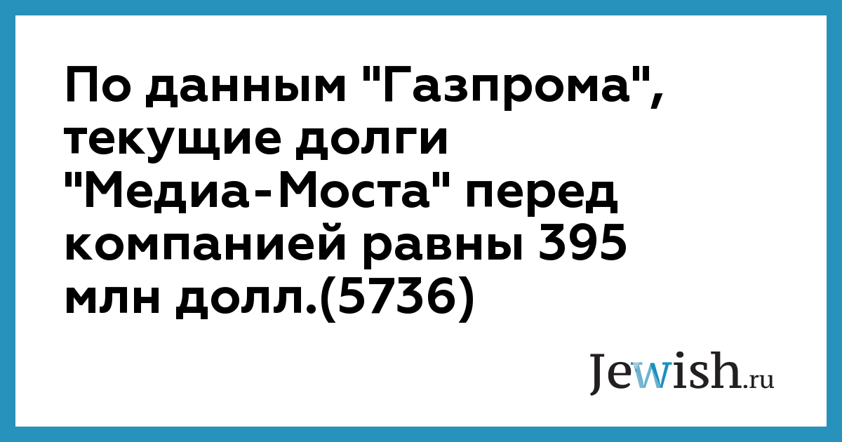 Совокупная задолженность группы "Медиа-Мост" перед ОАО "Газпром" превышает 940 млн долл. По словам пресс-секретаря ЗАО "Газпром-Медиа" Аэлиты Ефимовой, об этом заявил председатель совета директоров "Газпром-Медиа" Александр Казаков. По его словам, "Газпром" в период с 1996г. по 1999г. выдал или гарантировал "Медиа-Мосту" кредиты именно на эту сумму. Причем ни один из них не был погашен. В большинстве случаев задолженность списывалась в обмен на долю акций НТВ и других компаний группы "Медиа-Мост". Текущая задолженность группы "Медиа-Мост" составляет 395 млн долл. Крупнейшим кредитором "Медиа-Моста" является компания Credit Suisse Financial Products (CSFP) — 262 млн долл. Гарантом по этому кредиту, срок погашения которого истекает в июле 2001г., выступает "Газпром". В случае невыполнения обязательств ему придется выплатить CSFP полную сумму кредита. В свою очередь, задолженность группы компаний "Медиа-Мост" перед "Газпромом" равняется 133 млн долл., включая 40 млн долл., выданных телекомпании НТВ. Среди других кредиторов "Медиа-Моста" фигурируют: Сбербанк РФ — 149 млн долл., Минфин РФ — 124 млн долл., Внешторгбанк — 40 млн долл., АКБ "Имидж" — 25 млн долл.