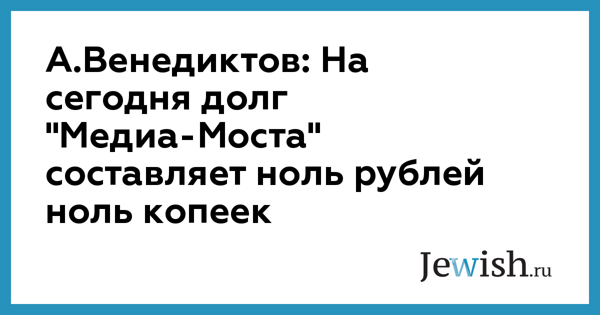 На сегодня долг "Медиа-Моста" составляет ноль рублей ноль копеек — заявил журналист Алексей Венедиктов в Санкт-Петербурге 10 апреля на пресс-конференции, посвященной ситуации вокруг "Медиа-Моста". По его словам, "Медиа-Мост", являющийся одним из акционеров телекомпании "НТВ", принял на себя обязательства по выплате долга Мост-Банка и в ближайшее время намерен рассчитаться по нему. Следующая выплата должна произойти 10 июля 2001 года. До этого момента РАО "Газпром" не имеет контрольного пакета акций телекомпании "НТВ", а потому проведенное собрание акционеров и переизбрание главного редактора творческий коллектив "НТВ" считает незаконным, в связи с чем сегодня телекомпания подала в суд на незаконность проведения собрания акционеров и признание их результатов недействительными. А.Венедиктов сообщил, что компания ведет переговоры с консорциумом Теда Тернера. "Мы хотим эту сделку и будем делать все, чтобы она состоялась", — сказал журналист. Журналист не скрывал удивления вчерашним интервью Владимира Путина и Герхардта Шредера немецкой компании ZDF. По словам А.Венедиктова, названный в интервью В.Путиным размер долга компании в 2 раза превышает сумму, привлеченную "Медиа-Мостом" за все время своего существования. А.Венедиктов считает, что конфликта можно избежать до июля месяца, когда определится реальный владелец компании — РАО "Газпром" или, возможно, акции распределятся между тремя акционерами.