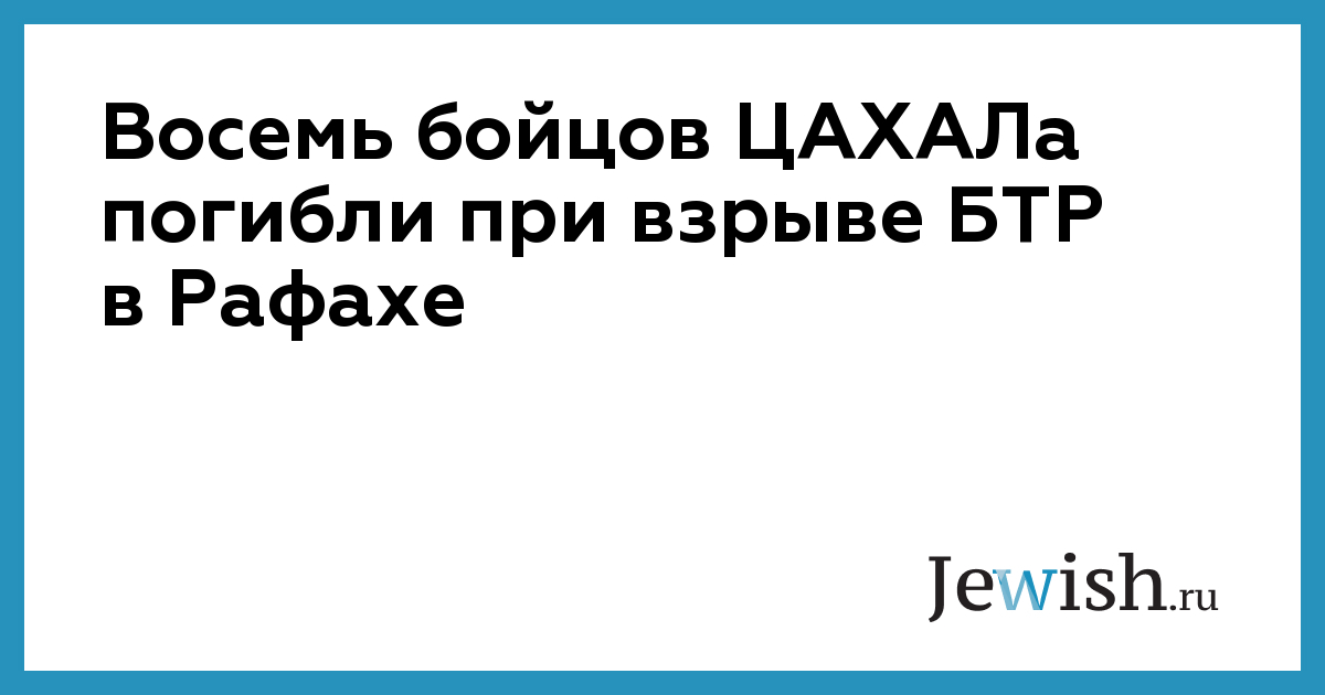 Восемь израильских военных погибли при взрыве БТР в ходе боевых действий в Рафахе на юге сектора Газа, сообщает The Times of Israel со ссылкой на заявление военных. По количеству единовременно павших бойцов это самый серьезный инцидент для армии с января этого года, когда в результате удара террористов ХАМАСА по комплексу заминированных зданий в центре сектора Газа погиб 21 военнослужащий, отмечает издание.