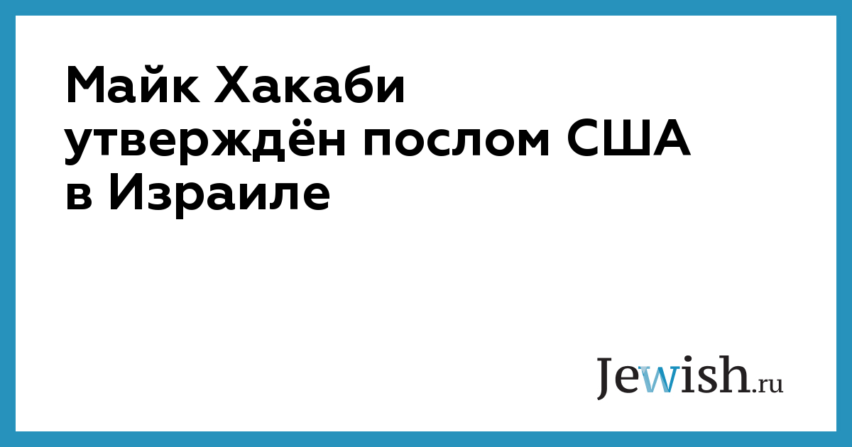 Сенат США утвердил Майка Хакаби, бывшего губернатора Арканзаса, на должность посла в Израиле. За его кандидатуру проголосовали 53 сенатора, 46 выступили против, сообщает The Times of Israel. В ходе слушаний Хакаби, известный своей поддержкой расширения израильских поселений и отвергающий принцип создания двух государств, заверил парламентариев, что будет работать «над продвижением политики администрации президента США, а не собственных взглядов».