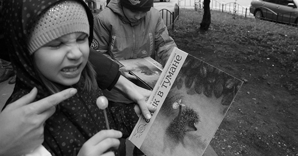 Миша и Алиса – двойняшки, немного аутичные, шустрые ребята. Бросаются навстречу каждому выходящему из дверей студии, потому что у каждого из них в руках книжки с ёжиком на обложке, постеры с ёжиком, пакеты. Они выходят довольные, с сияющими лицами. Покрутившись возле них, дети возвращаются к маме с папой. «Мишка у нас знает имена всех, кто озвучивал роли, и вообще всех, кто в титрах отмечен, – говорит его мама. – Песенка из мультика у него самая любимая. В общем, он у нас отчаянный фанат!» В этот момент из дверей подъезда выходит дама с целой стопкой книжек с ёжиком на обложке – Мишка смотрит на книжки восторженно, а Алиса завистливо поджимает нижнюю губку.