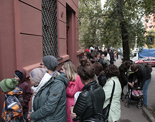 Цепочка поклонников, несмотря на холод, действительно растянулась по улице метров на сто.