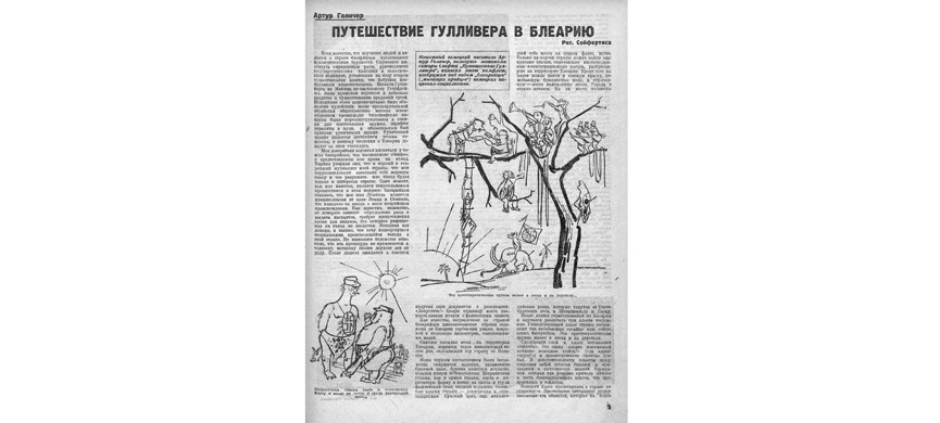 Вот несколько путевых заметок Гулливера из Блеарии: «Брюква является исключительной пищей 80% населения. Основные краски страны –коричневая и серо-солдатская». Города в Блеарии исчезли, остались только леса. В стране есть три класса населения. Осафы – истинные арийцы – проживают в лесах и на деревьях. Следующий класс – гейлоты. Название происходит от немецкого приветствия «хайль» и греческого слова «илоты», то есть рабы. Это остатки бывшей мелкой буржуазии, которая так усердно кричала «хайль!» в честь господствующего класса, что превратилась в рабов. Обитателей концлагерей называют концентральными европейцами. Питаются они отбросами брюквы, навозом и жалкими объедками, которые им бросают наиболее сердобольные блеарийцы через изгородь.