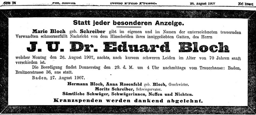 Эдуард Блох родился 30 января 1872 года в крошечном городке Фрауэнберг в Южночешском крае. Он изучал медицину в Праге, затем поступил в австрийскую армию и стал военным врачом. Когда Эдуарду было 27 лет, его направили в Линц, столицу Верхней Австрии, где врач в итоге решил остаться насовсем. Кабинеты и квартира Блоха находились в одном и том же старинном здании на Ландштрассе, так что пациентов доктор принимал с раннего утра. Он быстро заработал славу «лучшего врача для бедняков», поскольку с пониманием относился к людям, работал без тарифа и частенько вообще не получал вознаграждения.