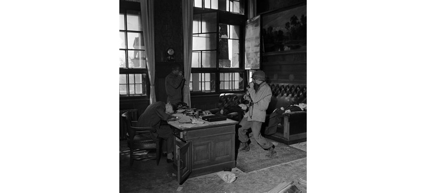 Миллер же снимала везде и всегда, беспощадно по отношению к себе и будущим зрителям своих фотографий. Она, например, сняла акт самоубийства в Лейпцигской ратуше перед приходом союзнических войск. На фото – мертвый заместитель бургомистра Лейпцига Курт Лиссо, ветеран НСДАП, отравившийся вместе с женой и дочерью. Они сидят за столом, у девушки на пальто нарукавник с повязкой, на голове белая шапочка с красным крестом. Рядом с ней в кожаном кресле её мать с открытыми глазами, отец уронил голову на массивный стол. Барочная точность мортальной атмосферы делает фото шедевром.