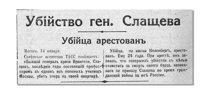 Вечером 10 января 1929 года Яков Слащев, экс-генерал Белого движения, а ныне преподаватель тактики на курсах офицеров Красной армии, праздновал свое 43-летие. Гулянку устроили в его комнате общежития в Москве. Поднимали тосты за советскую Россию, Слащев ругал барона Врангеля, у которого когда-то служил – разошлись уже под утро. Когда на следующий день в комнату к Слащеву постучали, он подумал, вероятно, что это вернулся «догуливать» один из гостей. Однако пришедший был ему не знаком. Гость без слов вытащил револьвер и почти в упор трижды выстрелил в Слащева. Экс-генерал скончался на месте. Его убийца не прятался и не пытался бежать. Он сдался милиции и при аресте заявил, что его зовут Лазарь Коленберг, он еврей, коммунист, а стрелял в Слащева из мести – за убийство брата и погром, которые десять лет назад белый генерал учинил в еврейском местечке под Николаевом.