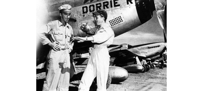 Например, в марте 44-го у его P-40 отказал двигатель – выпрыгнув с парашютом, он приземлился в океан, в котором провел девять часов в ожидании спасательной команды. Летом 44-го уже участвовал на Гавайях в авиашоу для президента Рузвельта. А 7 марта 1945 года пилот приземлился на первом из отбитых у японцев аэродроме Иводзимы. «Здесь не было ни травинки, и 28 тысяч тел просто гнили на солнце, –вспоминал он на склоне лет. – Вид и запах трупов, снесенных бульдозером в братские могилы, остались со мной навсегда. Там же я насмотрелся на тела наших морских пехотинцев, которым разворотили лица, чтобы извлечь золотые зубы. После этого я перестал считать японцев, творивших такие ужасные вещи, человеческими существами».