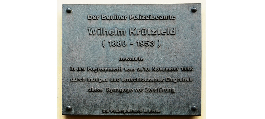 В берлинском районе Митте на фасаде Новой синагоги висит небольшая бронзовая табличка. Ее текст лаконичен: «В погромную ночь с 9 на 10 ноября 1938 года полицейский Вильгельм Крютцфельд спас эту синагогу от разрушения мужественным и решительным вмешательством».