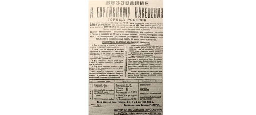 Немцы повторно оккупировали Ростов-на Дону в конце июля 1942 года. Первая оккупация – в ноябре 1941 года – продлилась всего неделю: в ходе Ростовской наступательной операции Красная армия очистила город от нацистов. Вот почему многие местные жители и на этот раз оставались в своих домах: очередного освобождения ждали со дня на день. Относительно спокойно восприняли и нацистский указ, предписывающий всем евреям города явиться 11 августа в определенные сборные пункты, взяв с собой ключи от квартир, ценности и наличные деньги. В развешанных по городу листовках с текстом указа утверждалось, что евреев переведут в особый район, где они будут защищены от военных действий. Более 27 тысяч человек – почти все еврейское население города – пришли на сборные пункты в назначенный день. Все они – включая детей, стариков и женщин, были, как скот, свезены в Змиевскую балку и там жестоко убиты. Эта трагедия стала одной из крупнейших массовых казней евреев, устроенных нацистами на оккупированной территории СССР.