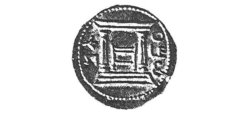 На этой монете можно увидеть вход с украшением над ним, четыре колонны по сторонам и какой-то предмет внутри. В прошлом некоторые ученые думали, что здесь изображен Первый Храм, а предмет – это Ковчег Завета. Но зачем восставшим изображать здание, разрушенное за пять веков до них, когда они помнили Второй Храм и могли бы изобразить его? К тому же предмет с полукругом сверху вовсе не похож на Ковчег Завета. Да и известно, что Ковчег Завета стоял в Святая святых, скрытый от глаз людских, а не открытый взору, как на этом рисунке!