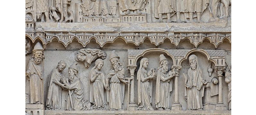 На правом и старейшем портале собора, созданном в конце XII – начале XIII века, изображена история родителей Девы Марии, Анны и Иоакима. Поскольку они были евреями, скульптор показал их такими, какими видел современных ему иудеев. На голове Иоакима заостренная шляпа – по решению Латеранского собора 1215 года евреи должны были носить особые головные уборы, позволяющие христианину сразу понять, с кем он имеет дело. То же самое касалось одежды – евреям следовало одеваться отличным от христиан образом, чтобы сохранять четкую границу между двумя религиозными группами. Благодаря порталу святой Анны можно судить, как примерно выглядели евреи Франции в Средние века – мы видим их в бесформенных длинных одеждах и в высоких заостренных шляпах.