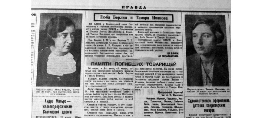 Люба Берлин, улыбаясь, попросила Бронтмана написать в завтрашней заметке ее фамилию как «Берлин-Шапиро». Она недавно вышла замуж и теперь везде представлялась так, двойной фамилией – чтобы муж не обижался и не завидовал ее известности. Ее напарница, Тамара Иванова, которой тоже предстояло прыгать, смеялась: «Дальше, чем в 100 метрах, не раскроюсь!» Речь шла о раскрытии парашюта. Парашютистки обещали рекорд самому Сталину – им предстояло прыгнуть с высоты 5000 метров и раскрыть парашюты после 80 секунд свободного падения. Они должны были стать первыми девушками в мире, выполнившими такой сложный прыжок.