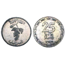 Над виноградной гроздью была помещено надпись «Израиль» на иврите, а под ней — по-арабски. На другой стороне также на иврите и арабском указан номинал (25 миль) в обрамлении стилизованных оливковых ветвей. Год выпуска был обозначен по еврейскому летоисчислению, то есть прямо от сотворения мира.